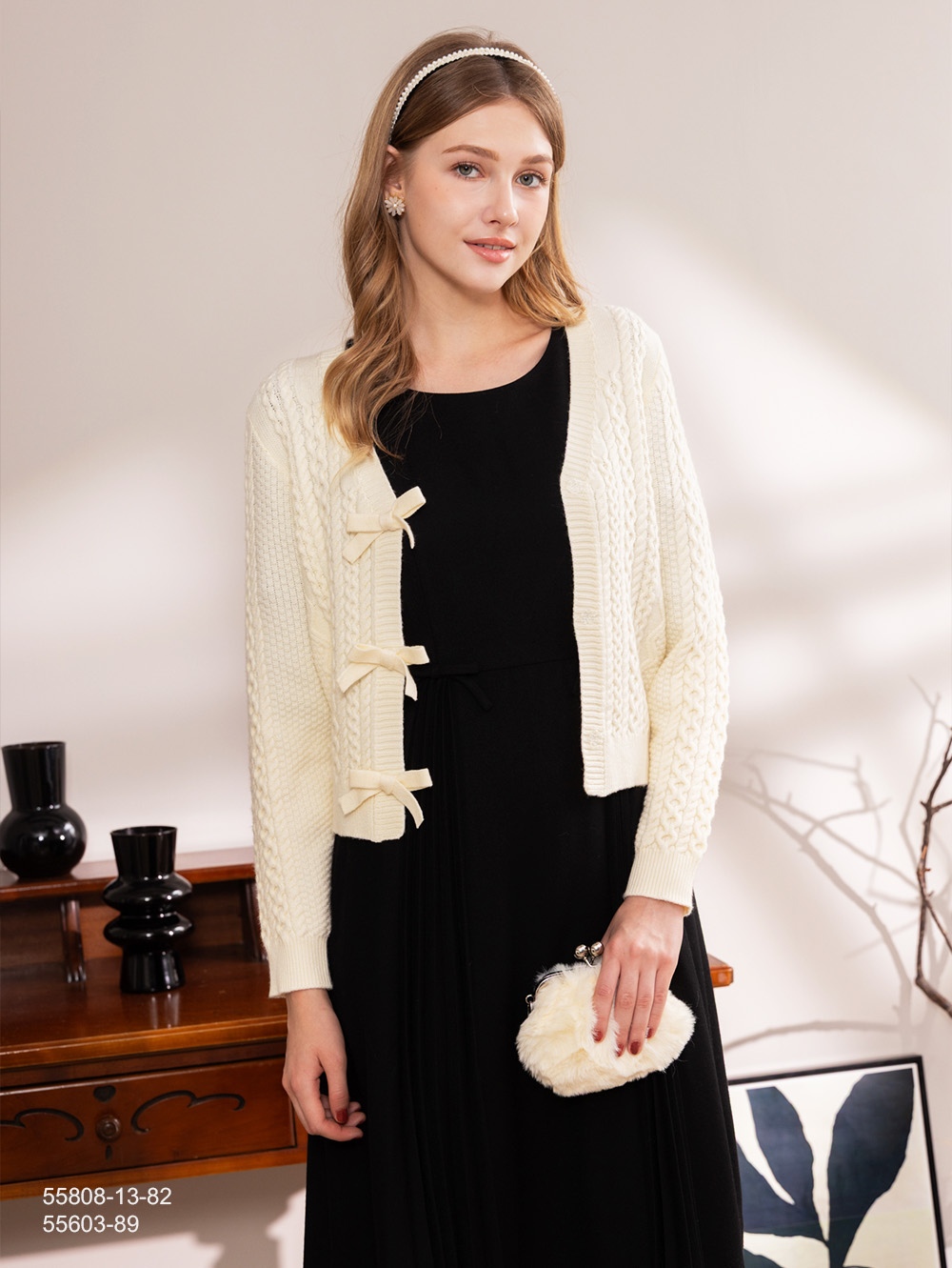 V領麻花針織上衣-淺米白