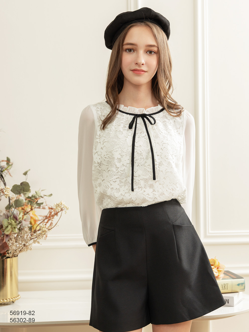 雅致蕾絲小荷葉領雪紡上衣-淺米白