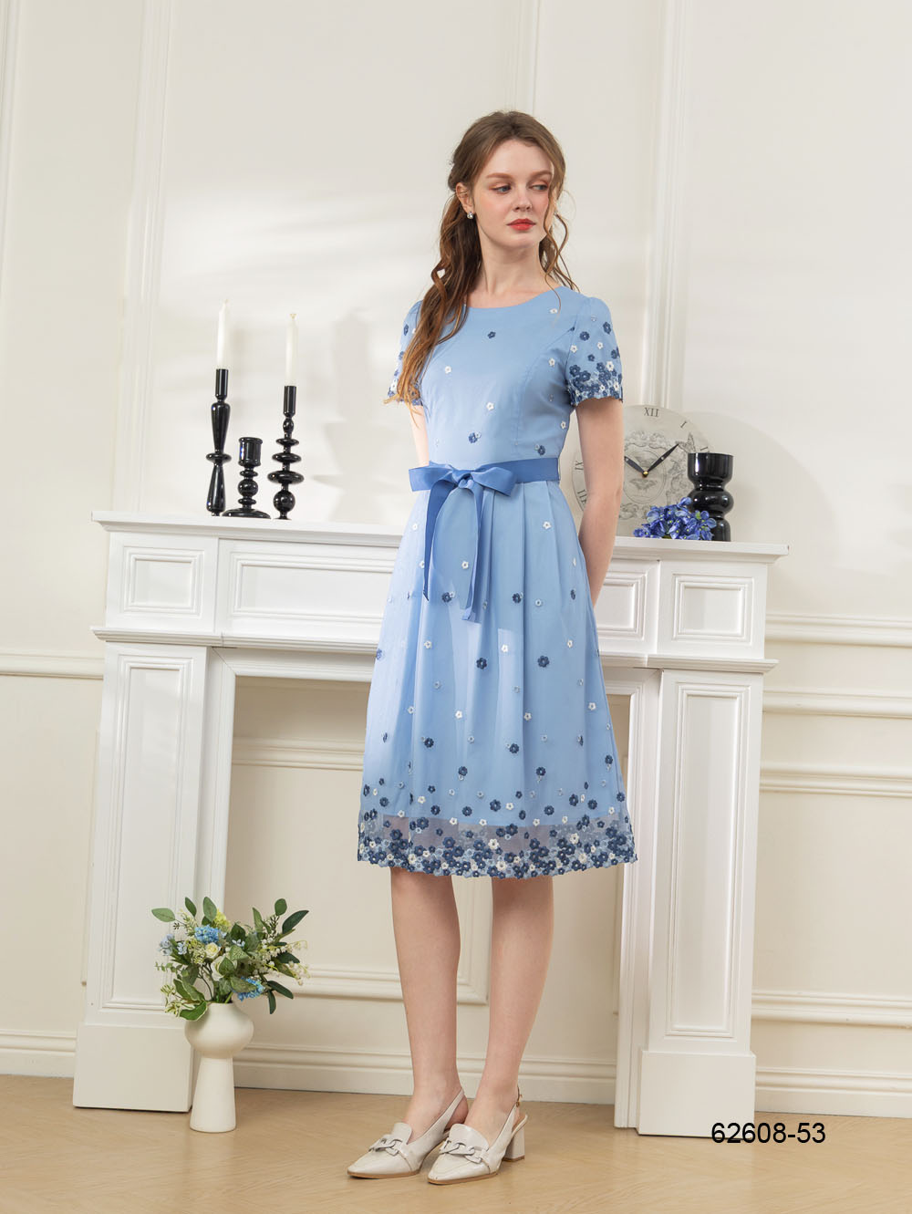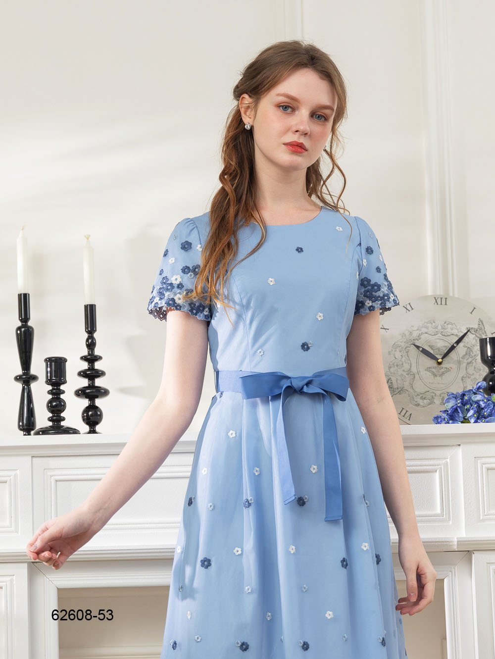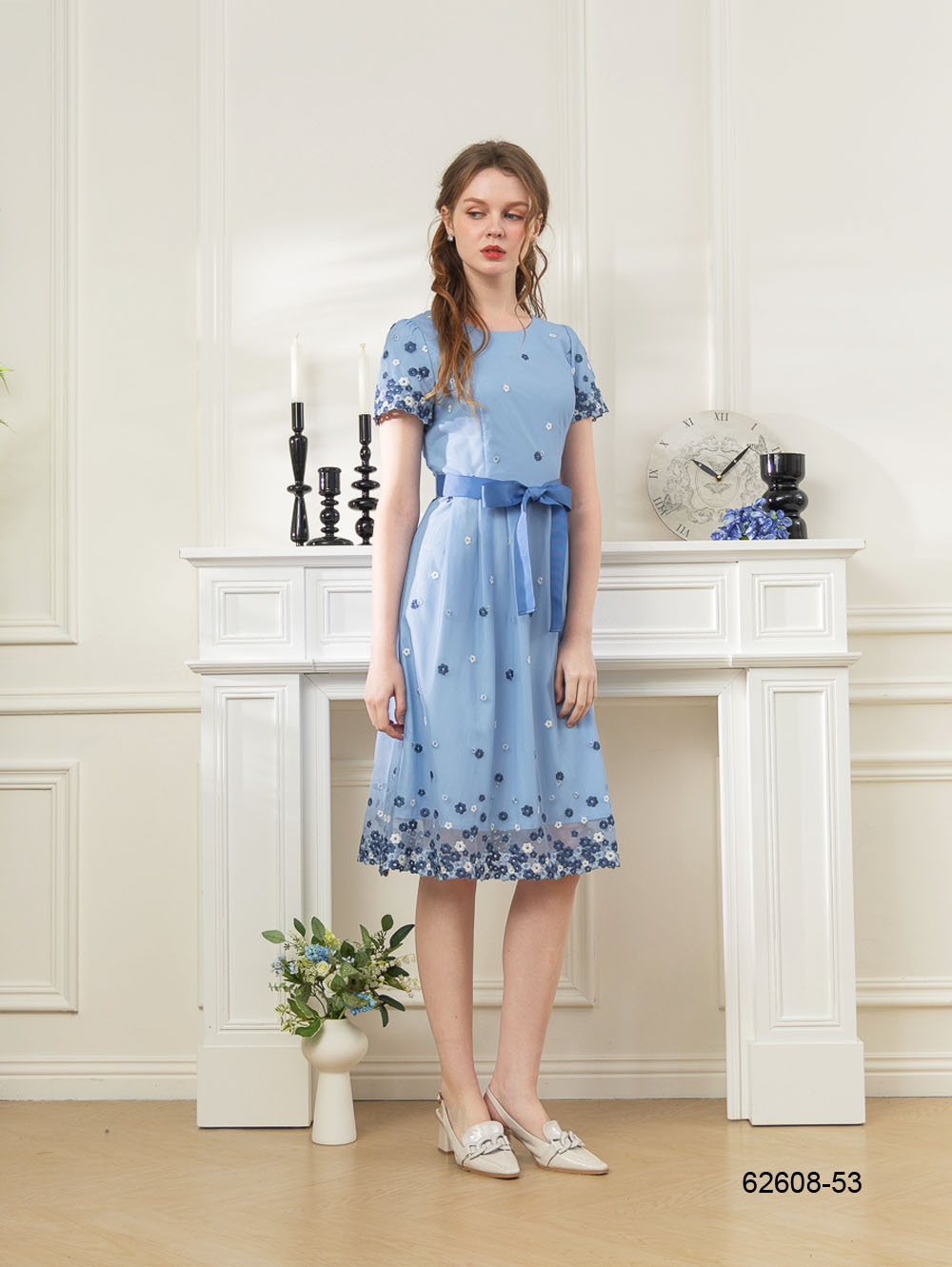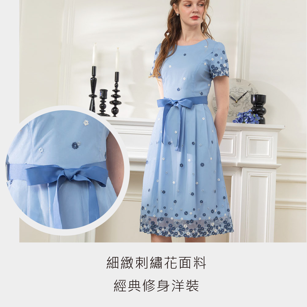 繁花盛夏刺繡網紗洋裝-藍色